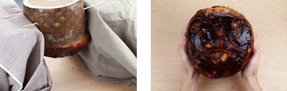 Cuando esté listo, deberemos pincharlo en la base con un tenedor especial para Panettone o con palos gordos y largos de madera (tipo los de los brochetas). Después lo colocaremos boca abajo, suspendido entre dos jarras, ollas, libros,… lo que tengamos para que la superficie no toque la mesa. ¡No debemos saltarnos este paso, ya que es la clave para que el Panettone quede esponjoso!
