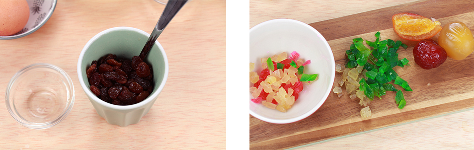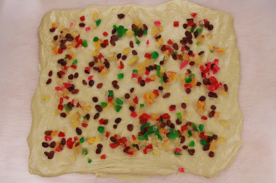 Mezclaremos las pasas maceradas con la fruta confitada y lo repartiremos por toda la superficie de masa.