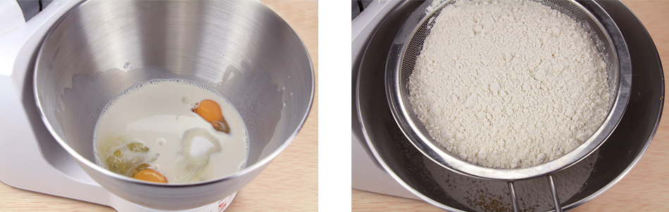 A la mezcla anterior, le añadiremos el agua de azahar, el extracto de vainilla i la ralladura de naranja. Cuando esté todo integrado, tamizaremos sobre la mezcla la harina de fuerza. También agregamos la sal.