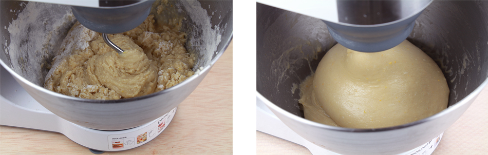 Ponemos el bol en la batidora y, con el gancho de amasar, empezamos a batir a velocidad baja para que los ingredientes no salgan disparados. Cuando la harina ya se haya absorbido, lo pondremos a máxima velocidad durante unos 20-25 min. Es imprescindible trabajar todo este tiempo la masa para que se desarrolle el gluten de la harina. Para saber si la masa está lista, estiraremos un poquito de masa con los dedos y si se forma una membrana elástica y resistente, ¡ya lo tenemos! Hasta que no se forme esta membrana no debemos dejar de amasar, no pasa nada si necesitamos más tiempo del indicado anteriormente.