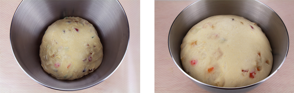 Hecho esto, enrollaremos la masa desde un lateral hasta el lado contrario y luego formaremos una bola. De esta manera nos aseguraremos que las pasas y la fruta quedan bien integradas y dentro del Panettone. Engrasaremos con aceite un bol grande (bien grande ya que la masa debe duplicar su tamaño) y colocaremos la bola dentro. Lo cubriremos con papel film y lo dejaremos fermentar durante 2 o 3 horas o hasta que doble su tamaño. Os recomiendo colocar la masa en un lugar cálido (entre 20ºC y 24 ºC), para favorecer el fermentado y agilizar el proceso. Si hace frío, ¡la masa no fermenta!