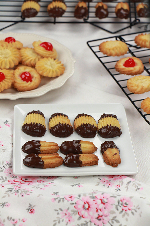 Para añadirle un toque diferente, podemos también bañar algunas de las galletas en chocolate. Yo opté por mojar las puntas de las galletas alargadas, así como media de unas más chiquititas que hice al último momento para probar ideas distintas. Pero también podríais bañar las rosquillas por la mitad o la parte inferior de las rosetas. ¡Dejad volar vuestra imaginación!