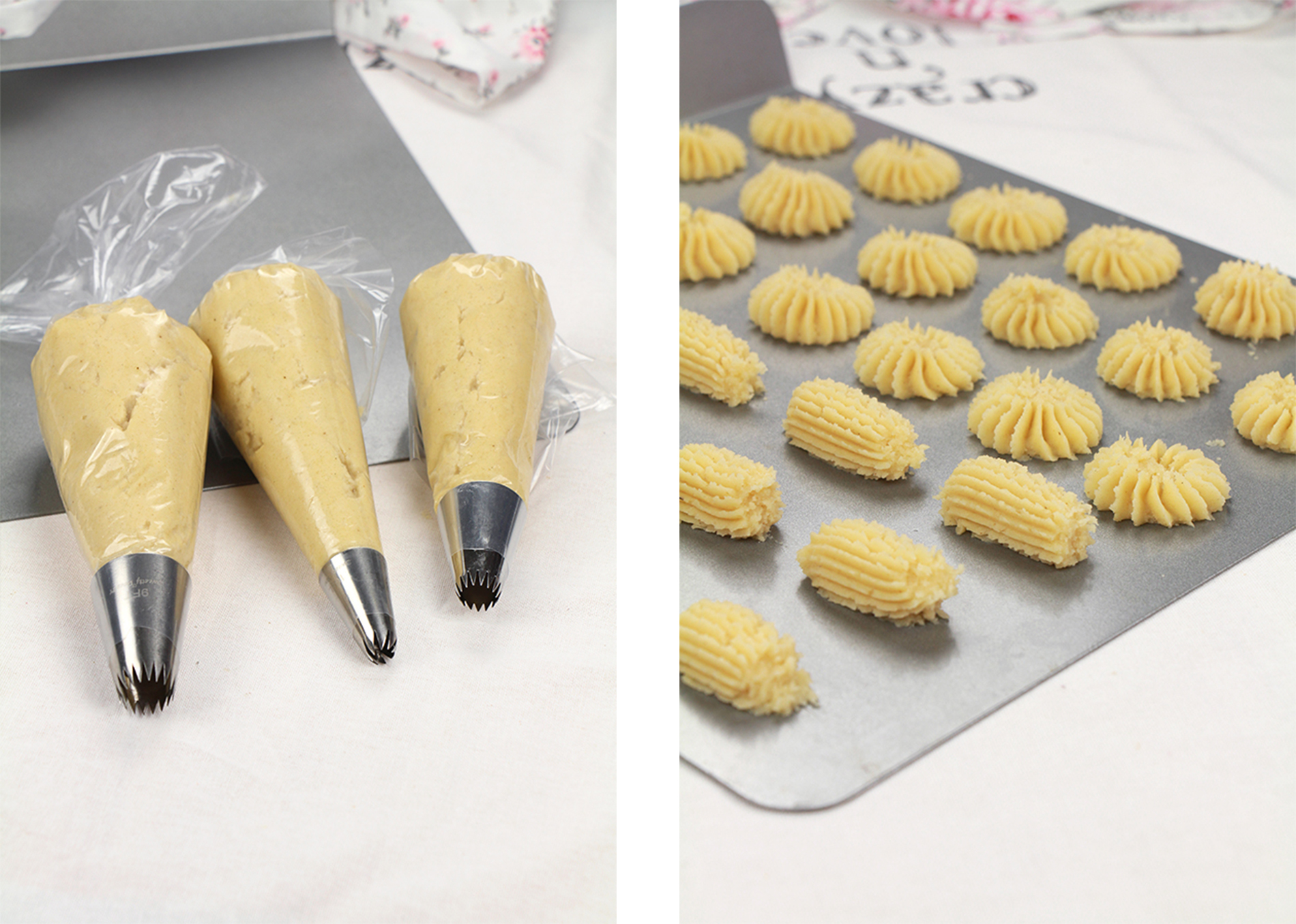 Antes de formar las pastitas hay que preparar las bandejas. Podemos usar bandejas para galletas antiadherentes o bandejas con papel vegetal. Si no tenéis ninguno de los dos, podemos usar una bandeja engrasada, con un poco de spray o mantequilla. Después formaremos las galletitas: yo utilicé una boquilla de flor fina para las pastitas circulares, enrolladas sobre sí tipo rosquilla; una boquilla de estrella mediana para las rosetas y una boquilla de estrella grande para las alargadas.