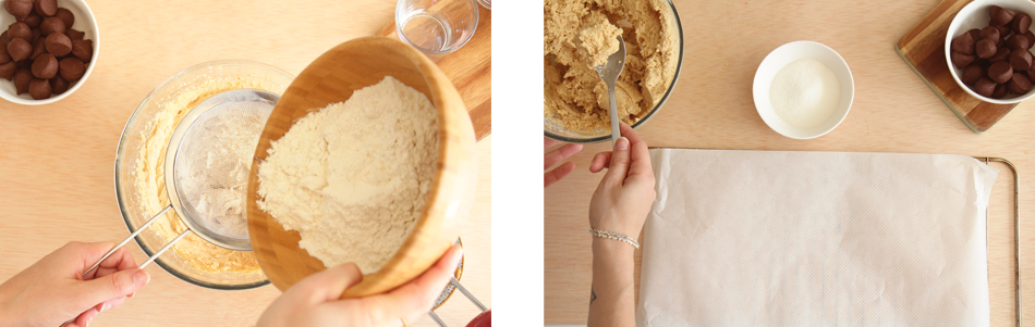 Cuando todos los ingredientes estén bien integrados, tamizamos la harina, el bicarbonato y la sal y lo volvemos a mezclar todo hasta que quede bien integrado. Debe quedar una masa densa pero manejable.