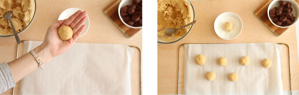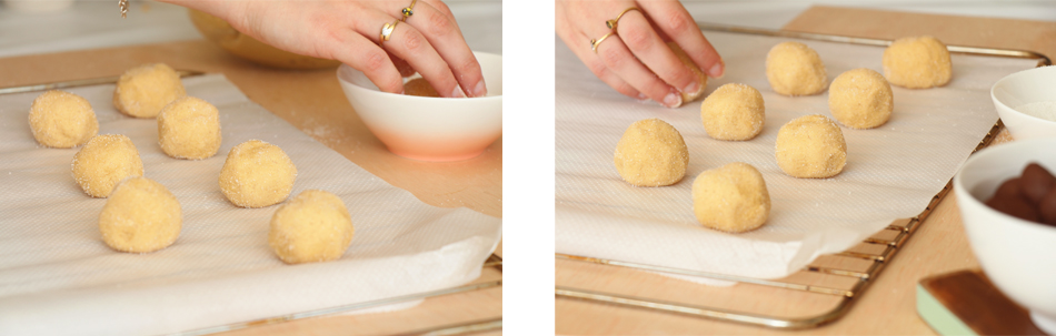 Con la ayuda de una cuchara, empezamos a hacer bolas que, antes de dejar sobre la bandeja de horno, rebozaremos en azúcar blanco. Repetiremos el proceso hasta acabar con la masa. A la hora de colocarlas es mejor no pegarlas mucho ya que crece un poco, pero con 3 o 4 dedos será suficiente.