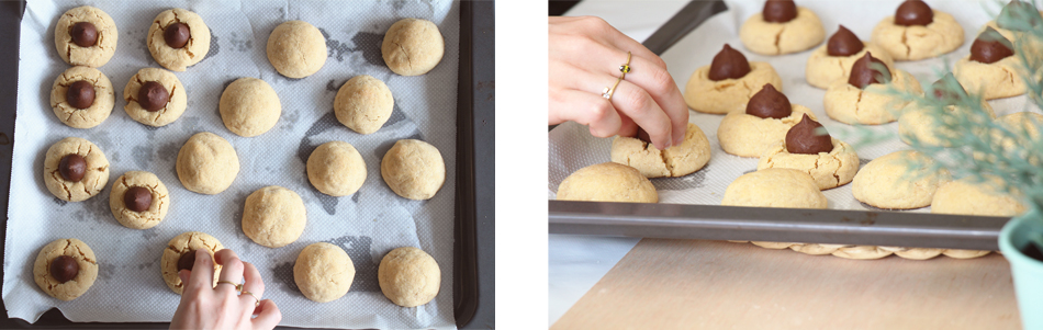 Llevamos la bandeja al horno durante unos 8-10 min. Al retirarlo, colocamos inmediatamente los bombones en el centro de la galleta, para aprovechar que la galleta está blanda y se fije bien. Asegúrate que el bombón sea bastante grande, ya que si ponemos una pieza pequeña se deshará de seguida y tendremos simplemente chocolate derretido.