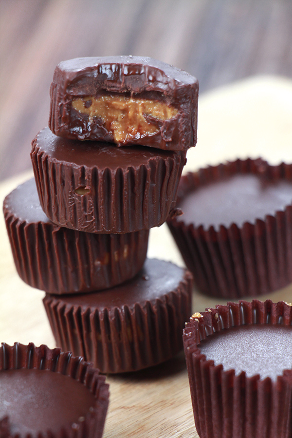 Estos mini bombones de chocolate rellenos de crema de cacahuete son una receta súper fácil y baja en carbohidratos, ideal para un caprichito dulce sin muchas calorías y sabroso. Son unas mini delicias muy típicas en Estados Unidos, hace poco viajé a California y los vendían en todas partes. Si nunca habéis probado los Reese’s os recomiendo mucho que lo hagáis, los originales o los vuestros propios con esta receta.