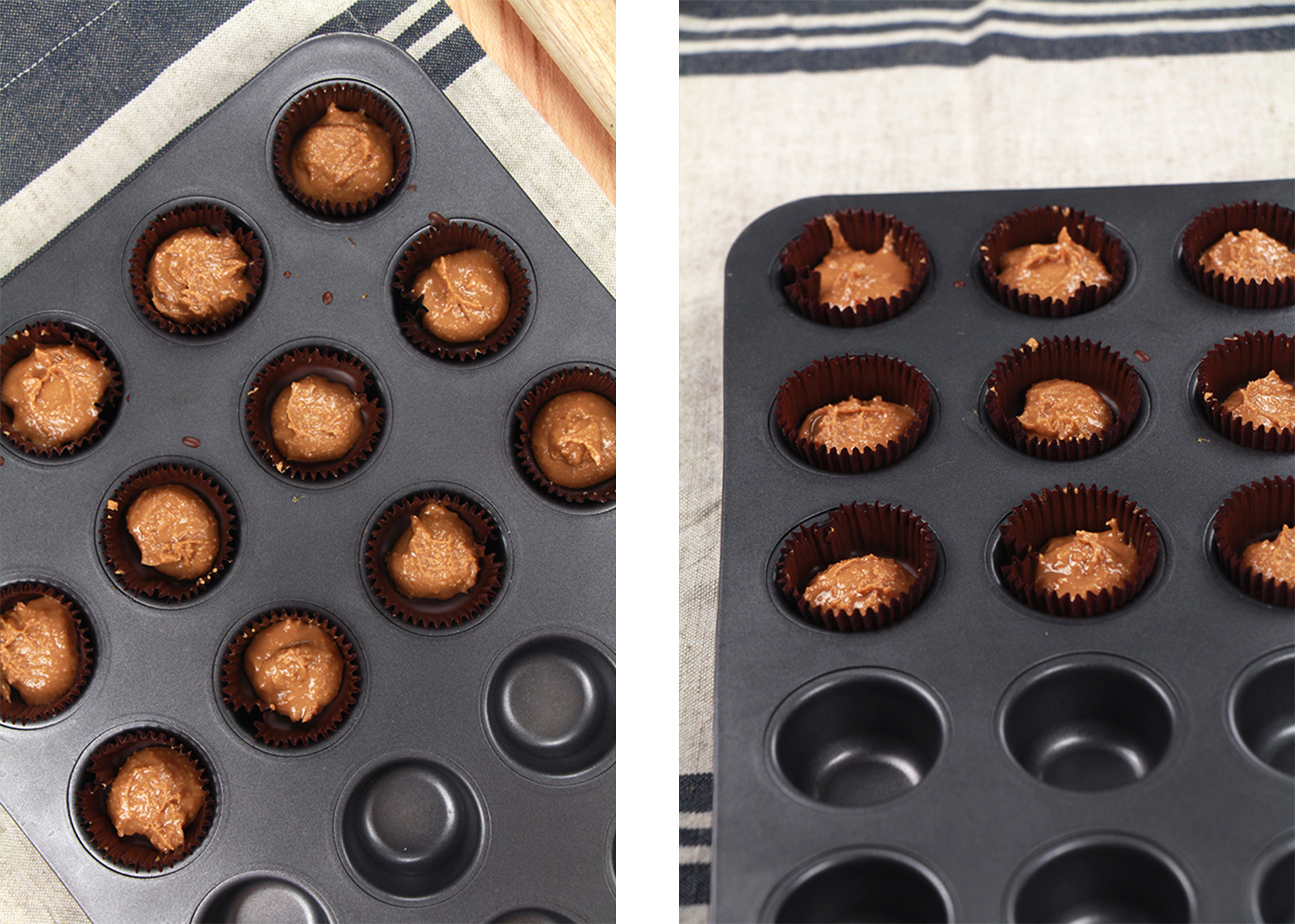 Pasados los 10 min, el chocolate habrá enfriado. Entonces verteremos media cucharadita de crema de cacahuete en el centro de cada cápsula, intentando que no llegue a las paredes de la cápsula. Podéis verter más si queréis darle un sabor más intenso a peanut butter. Como la mantequilla de cacahuete es mucho más densa que el chocolate, podemos seguir con la receta directamente, pero si lo preferís podéis llevar los bombones 5 min más al congelador. Después verteremos otra media cucharadita de chocolate fundido sobre la crema de cacahuete, o lo necesario para cubrirla. En este punto, lo llevaréis a la nevera un mínimo de 15 min o hasta que endurezcan. ¡Y listo! ¡Perfectos para devorarlos de un bocado!