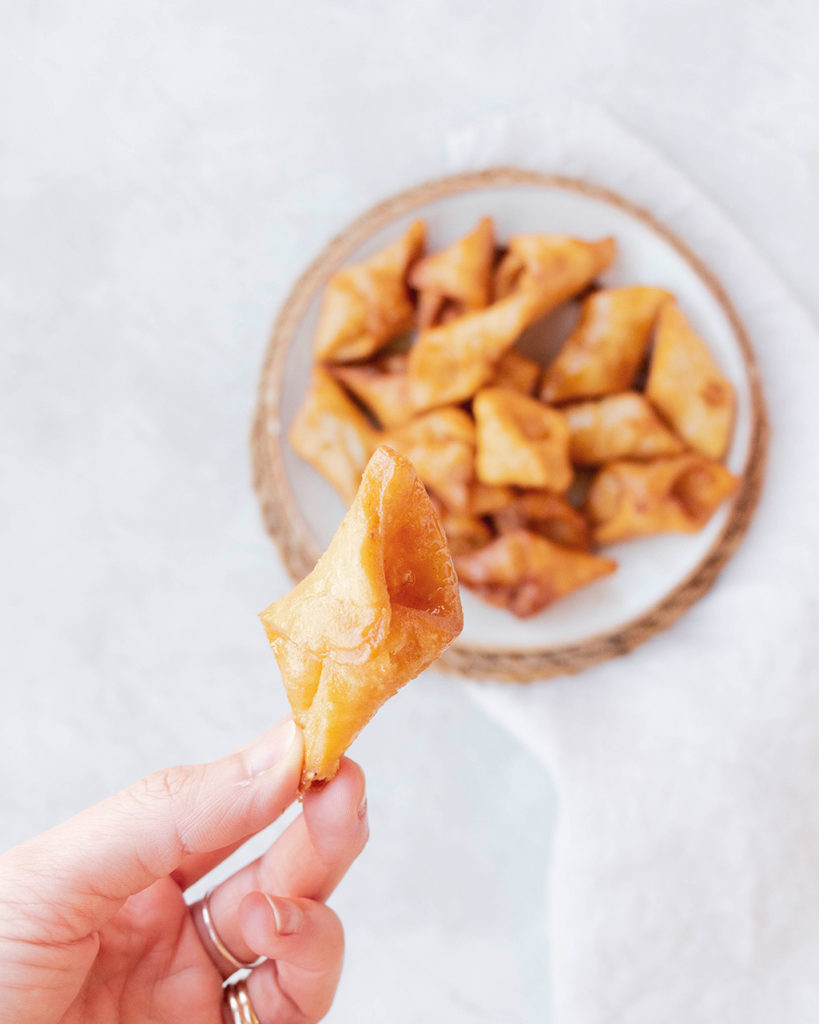 Con cada rectangulito haremos un pestiño: doblaremos los extremos hacia el centro, formando una especie de sobre torcido.