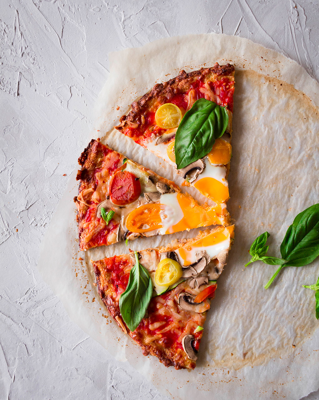 Una vez dorada, sacaremos la base del horno y pondremos los toppings. Primero extenderemos la salsa de tomate por toda la base. A continuación yo le puse el queso, porque no me gusta que cubra todo por encima, pero podéis añadirlo al final. Repartiremos los champiñones, los cherrys en rodajas y el calabacín en medias rodajas. Como toque final, pondremos un huevo en el centro. Todos los ingredientes son personalizables y totalmente opcionales.