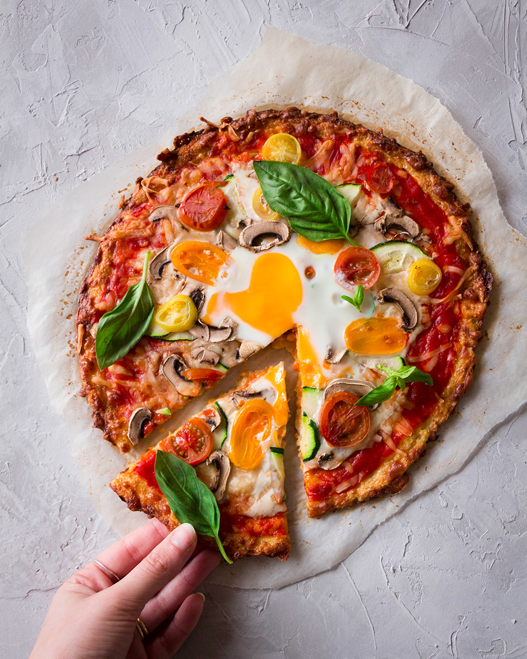En el blog tenéis varias recetas de pizza casera: vegetariana, sin reposo, con salsa casera y harina integral,… Hoy vamos a preparar nuestra pizza con una base de coliflor. ¡Sí lo habéis leído bien! No lleva harinas, por lo que es apta para celíacos o intolerantes al gluten. Recientemente este tipo de pizza, con una base vegetal, se ha puesto bastante de moda, pero quizás a algunos todavía os suena raro. La verdad es que yo también era un poco escéptica al principio, pero desde ya os digo que el resultado es increíble. Como se cocina la base de coliflor con antelación, sin los toppings, queda crujiente y perfecta, con un sabor y textura suaves en boca. La presencia final, como podéis ver en las fotos, es como la de cualquier pizza. Además la coliflor es una verdura que por sí sola tampoco tiene demasiado sabor, por lo que los condimentos resaltan mucho. Los ingredientes finales serán a vuestra elección, toda vegetal o incluyendo láminas de bacon, jamón, salmón, atún,…