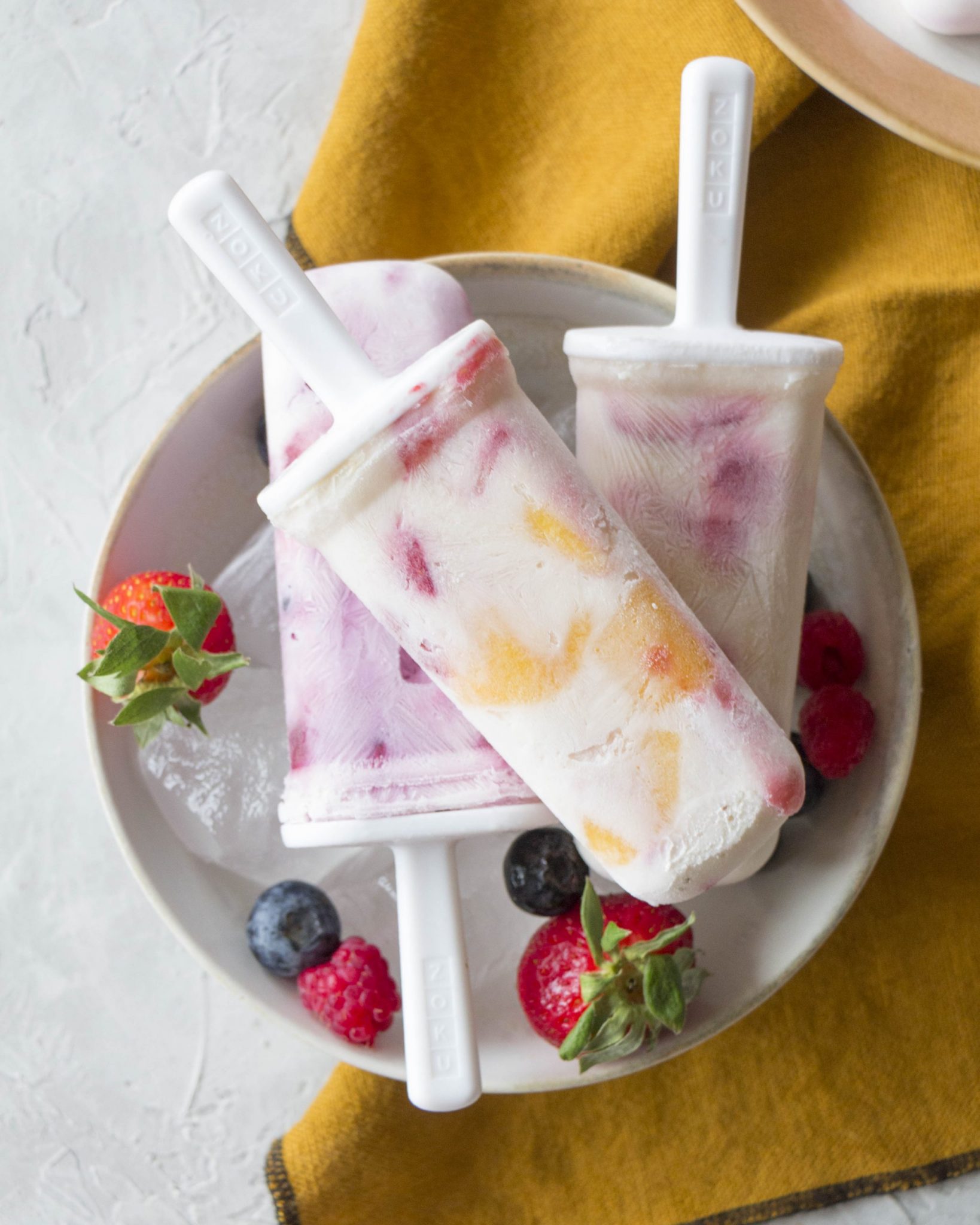 Este tipo de polos me trasladan a cuando era niña, recuerdo que no había nada mejor que un helado fresco cuando las temperaturas empezaban a subir. En verano, recuerdo con mis hermanas al acabar de comer coger un yogur de la nevera, clavarle una cuchara y ponerlo en el congelador, para tenerlo listo después de la siesta. Con qué poco nos conformábamos. Estos helados de yogur y frutas son un poco esos polos caseros que nos hacíamos, añadiéndole fruta natural y restándole azúcar. Win, win!