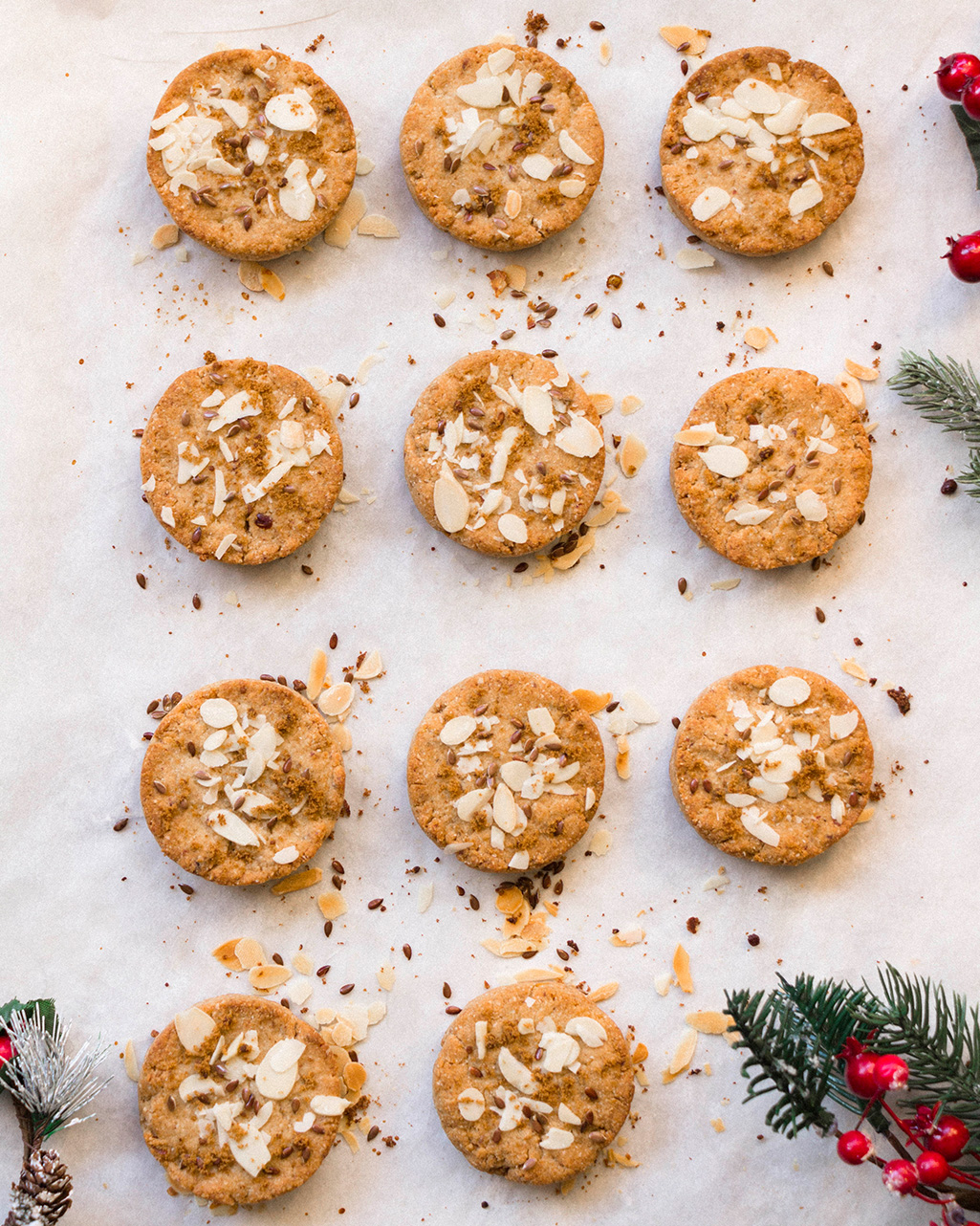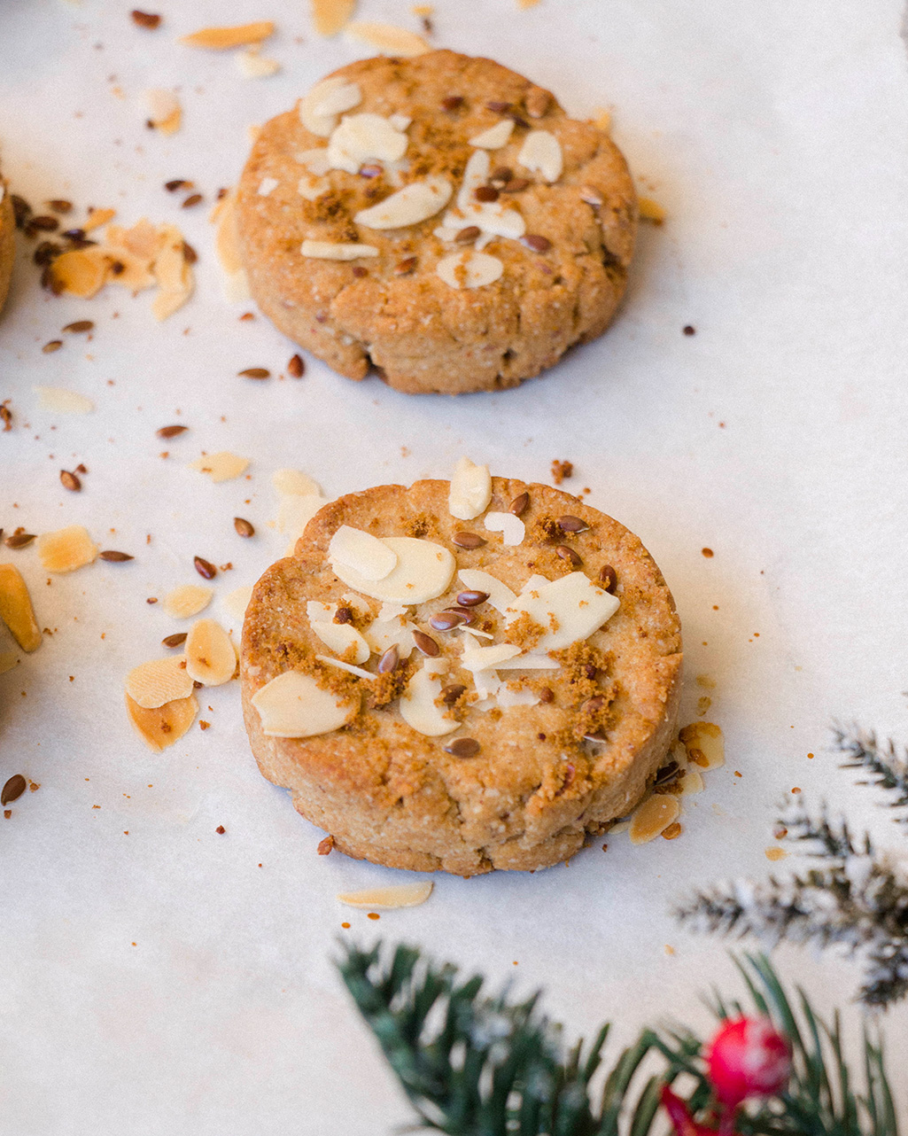 Pintaremos ligeramente los polvorones con leche / bebida vegetal o agua para que se peguen los toppings. Repartiremos unas semillas de sésamo y unas almendras laminadas por encima.