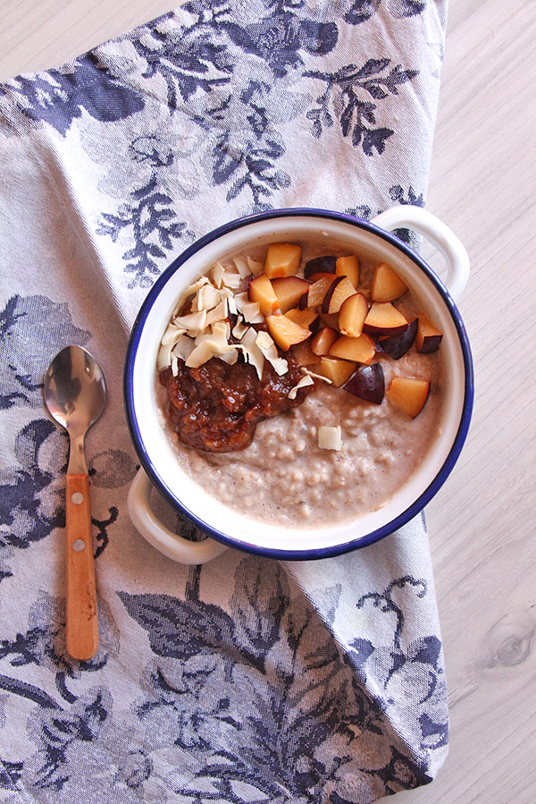 En este blog encontraréis recetas muy variadas, ¡pero que no falte nunca una buena receta de desayuno! Esta versión de porridge últimamente se ha convertido en mi obsesión: es bien fácil y rápido de preparar y me da energía para toda la mañana. Sabéis que en mi nevera nunca falta compota de manzana casera y que soy adicta a la leche de almendra, así que podéis entender porqué me flipa tanto esta combinación ¿no? Es una base que podéis adaptar de mil maneras, hoy os digo que es otoñal y en un mes le cambio algún ingrediente y ya es invernal. Top top. También podríais usar frutas secas o congeladas.