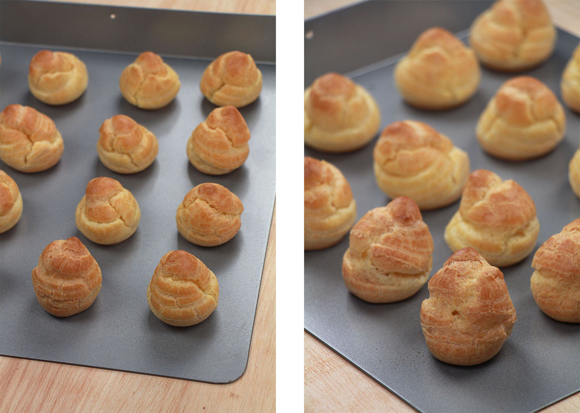 Trasladaremos la masa a una manga pastelera con una boquilla redonda lisa de 14 mm de diámetro. A parte prepararemos una bandeja apta para horno antiadherente o con papel vegetal en la que formaremos los profiteroles. Colocaremos la manga en posición vertical y presionaremos para hacer una especie de montañita, intentando mantener la manga recta en el centro. Debemos intentar que todos tengan la misma medida para que en el mismo tiempo de horneado se cocinen todos uniformemente. Cuando hayamos formado todos los profiteroles, si vemos que nos han quedado pequeños picos, nos humedeceremos el dedo y daremos unos golpecitos para alisar la superficie.