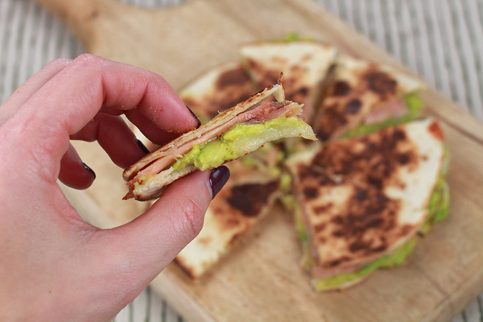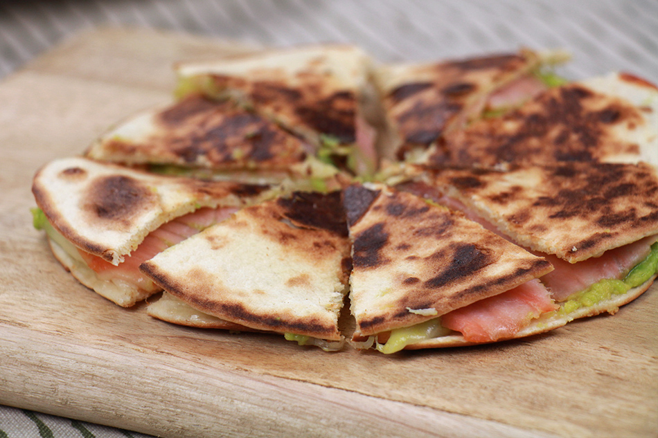 Estas quesadillas saludables van rellenas de un puré de aguacate, salmón ahumado y queso mozzarella. Una combinación perfecta, que entre la cremosidad del queso fundido, el sabor intenso del salmón y el toque del aguacate, se os fundirá en la boca. ¡Una cena ideal!