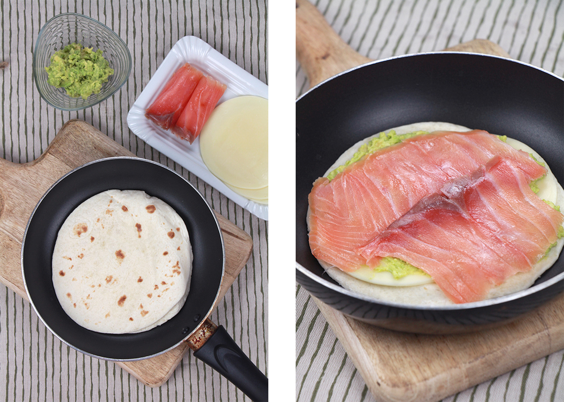 ¡Es muy sencillo! Simplemente tendremos que colocar una tortita en la sartén y encima el queso. Cubriremos con el puré de aguacate, asegurándonos que cubra toda la superficie. Encima colocaremos el salmón y taparemos con la segunda tortita.