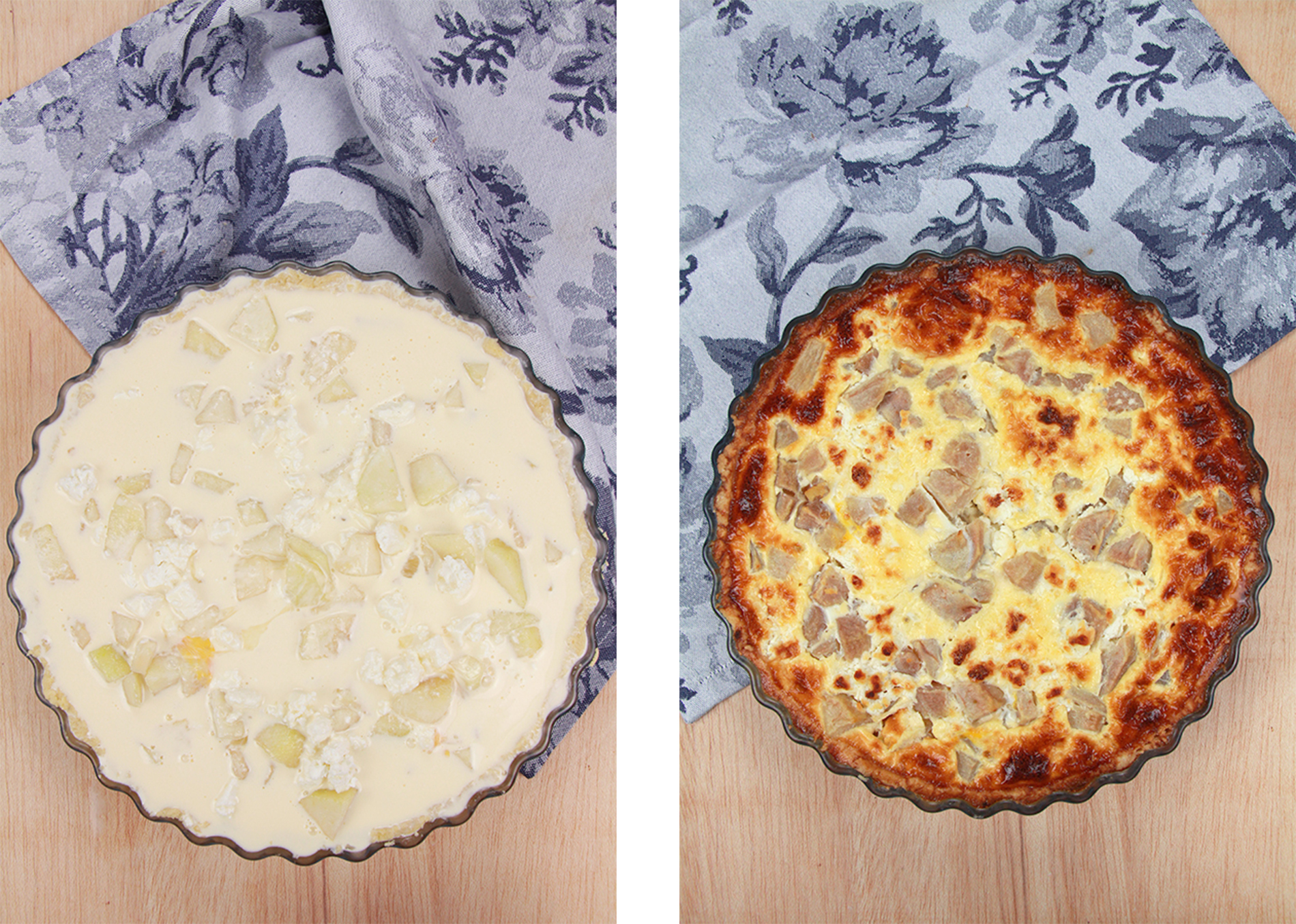 Una vez rellenada la tarta, la llevaremos al horno pre-calentado a 190ºC durante 30-45 min. Dependerá mucho del horno, por lo que deberemos fijarnos en el color que toma la quiche. Cuando esté bien dorada por encima y veamos que se ha cuajado, la podremos retirar. No os preocupéis si veis un poco de líquido por encima, pues es de las peras (sobre todo si son maduras), pero una vez enfríe se evaporará y quedará ¡perfecto!
