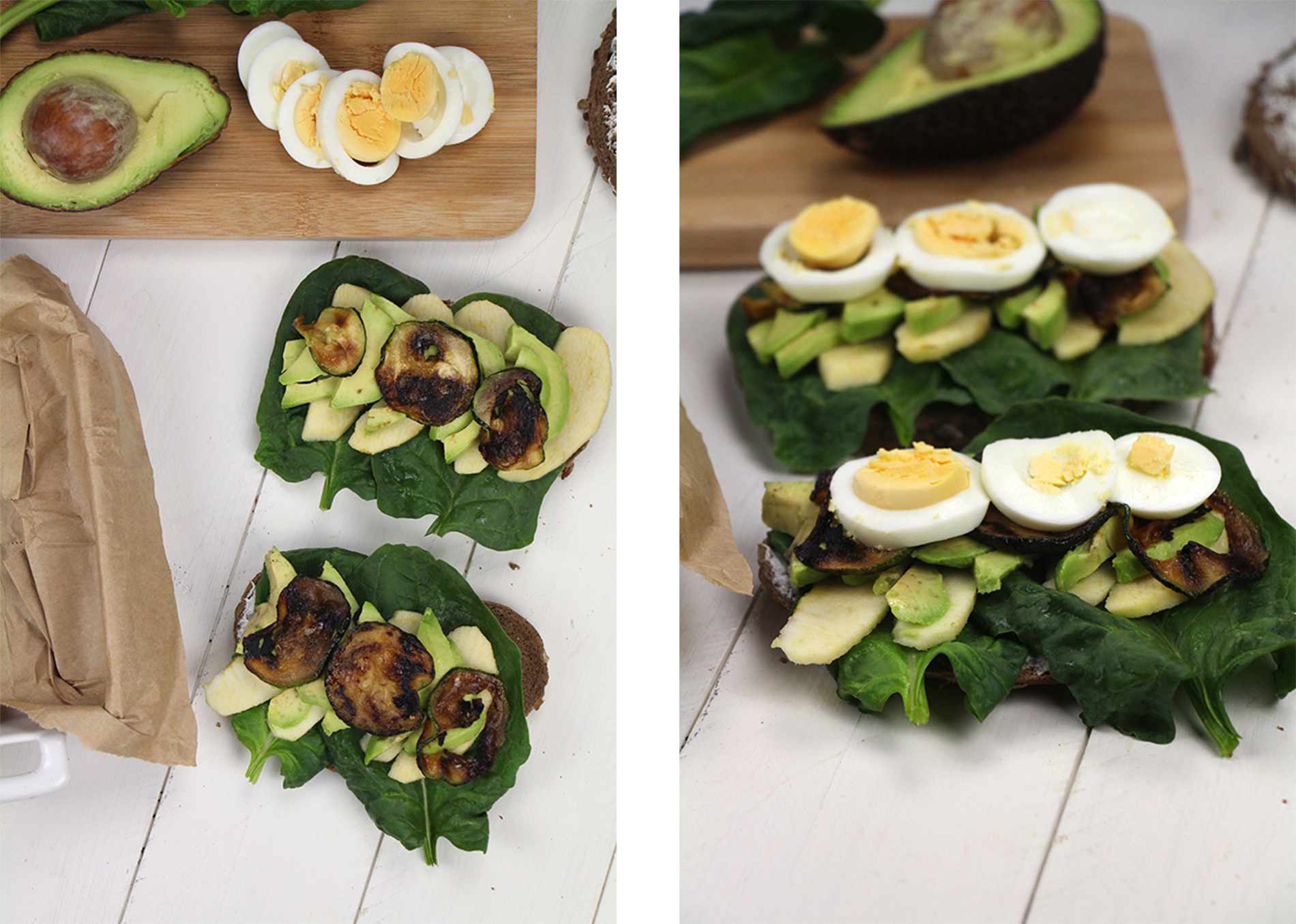 Untaremos las rebanadas de pan con queso crema u otro condimento de vuestro agrado. Pondremos en la base las hojas de espinacas y encima todos los ingredientes bien repartidos por toda la rebanada.
