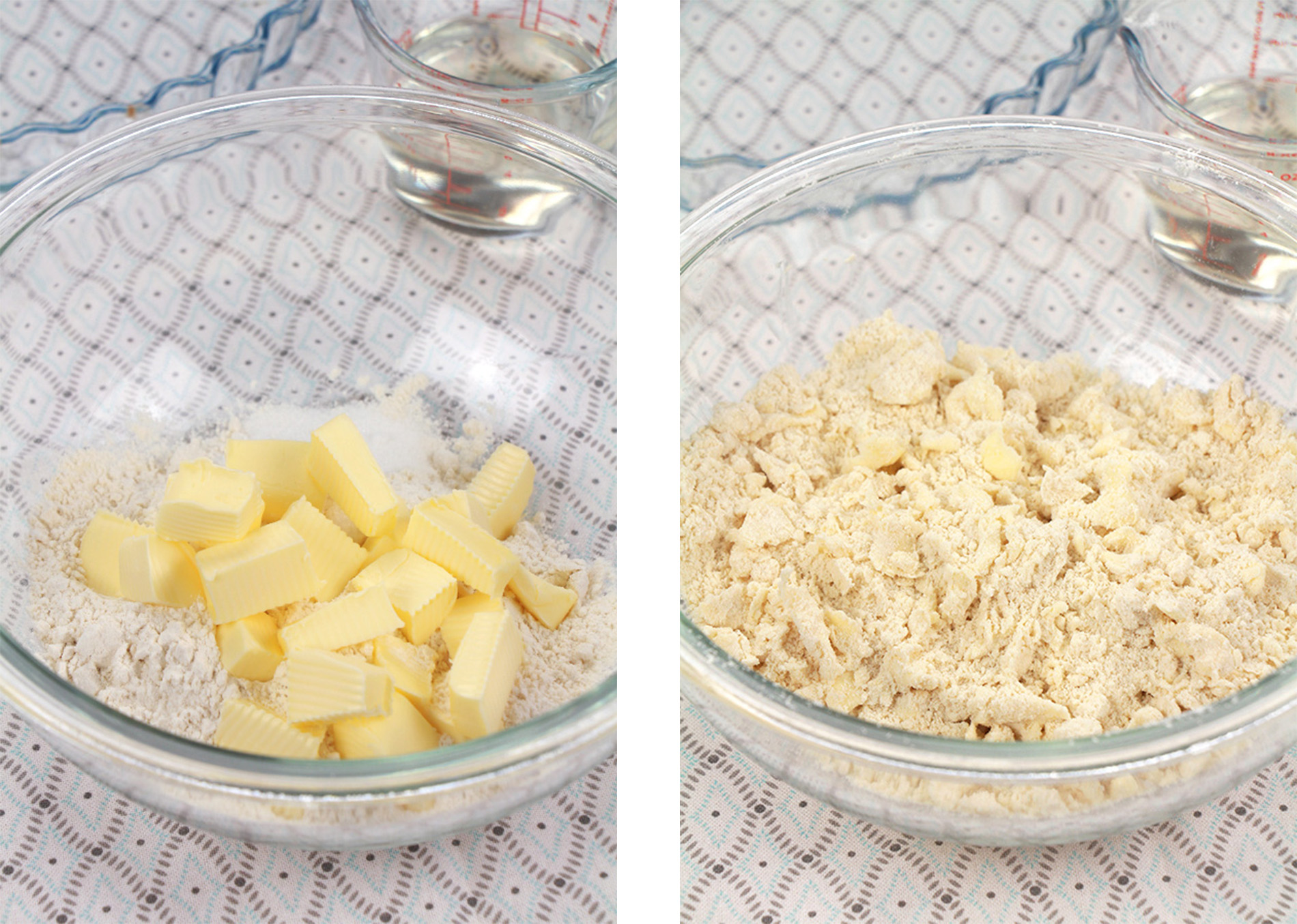 Si hemos decidido hacer la masa de la base de la tarta empezaremos mezclando la harina, la sal y el azúcar en un cuenco grande. Cuando estén combinados y bien mezclados, agregaremos la mantequilla fría cortada en pequeños cubitos.