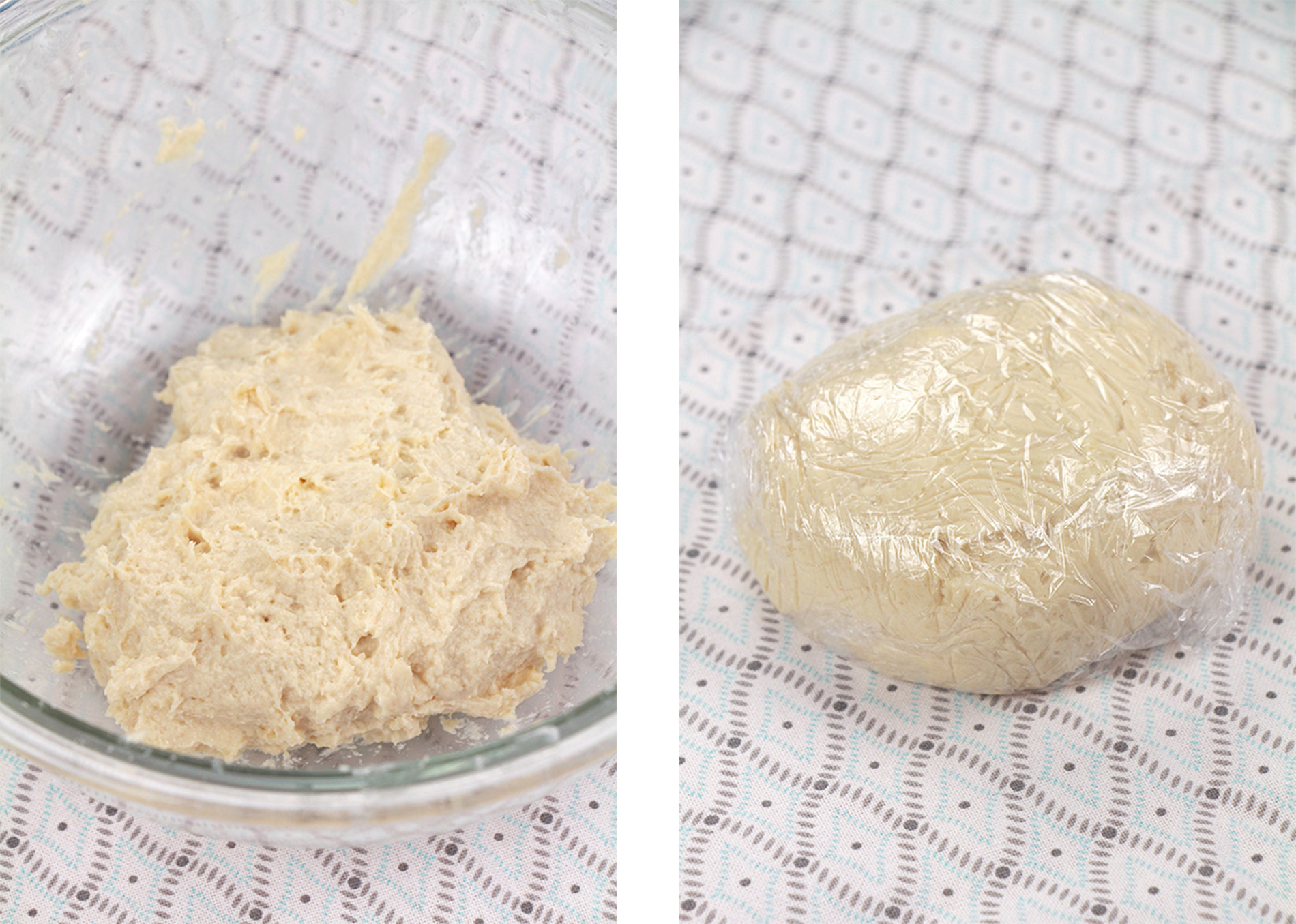 Después, con la ayuda de las manos y los dedos, trabajaremos la masa, aplastándola hasta conseguir unas migas gruesas. La mantequilla no debe derretirse, todo lo contrario, deben quedar como trocitos visibles. Siempre decimos que lo importante es amasar bien, pero en este caso es todo lo contrario, pero este truco es el que nos permitirá conseguir una base consistente y crujiente. A continuación, mezclaremos el agua fría con el vinagre y lo iremos incorporando a la mezcla en 2 o 3 tandas, integrándolo antes de añadir la siguiente tanda. Cuando no se nos peque a las manos, haremos una bola con la masa, la envolveremos en papel film y la dejaremos reposar en la nevera durante unas 2 o 3 horas. Incluso podéis dejarla toda la noche.