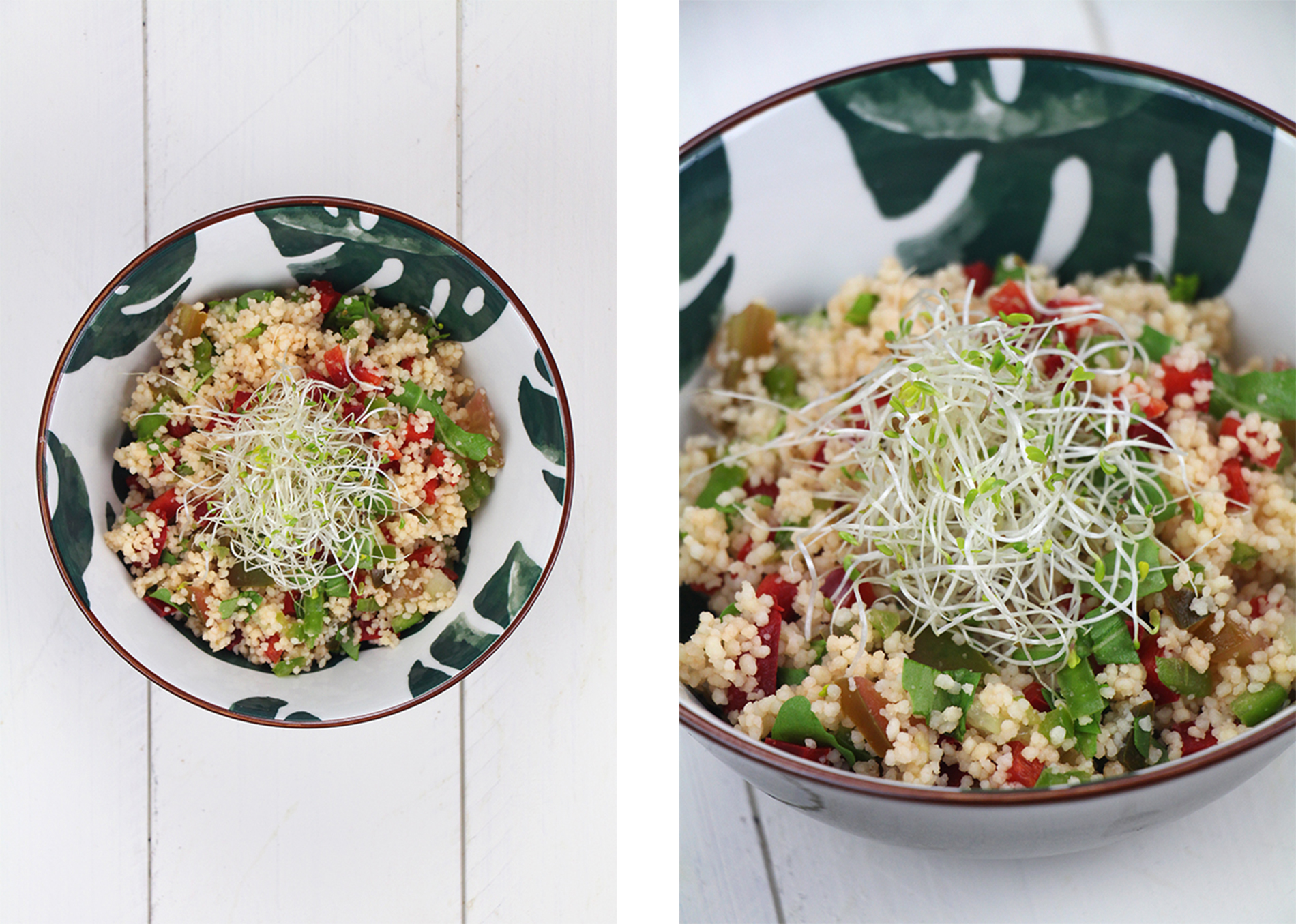 Cuando acabemos de cortar todas las verduras ya habrá terminado el tiempo de cocción del cous cous o bulgur. Entonces lo verteremos sobre el bol con verduras y lo removeremos bien para mezclar todos los ingredientes. Lo taparemos con papel film y lo llevaremos a la nevera un mínimo de 2 horas. Es importante dejar reposar la preparación y que esté refrigerada, porque así los sabores se combinarán mejor y el grano del cous cous o bulgur no estará apelmazado. Sin problema puede elaborarse de un día para otro y os puede aguantar hasta 2 días, por si decidís hacer más cantidad.