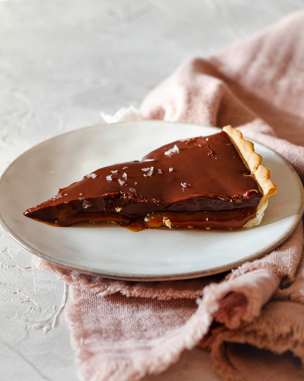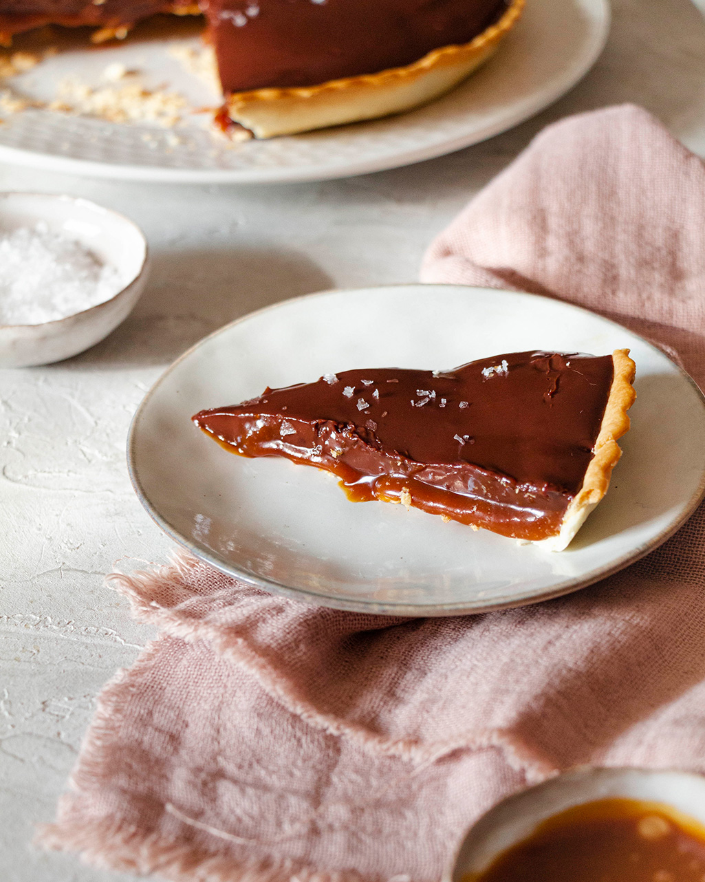 Bueno, y después de «daros la chapa» con el caramelo salado, os cuento que con él prepararemos una deliciosa y sencillísima tarta de caramelo salado y chocolate, compuesta de 3 capas: lleva una base de masa brisa (que podríais sustituir por galletas molidas o frutos secos picados y así no tener ni que encender el horno), encima una capa de caramelo salado y como topping final una ganache de chocolate negro. Vamos, ¡espectacular! Si tenéis una celebración o queréis daros un antojo, os recomiendo mucho esta receta, porque es hiper sencilla y quedaréis como reinas.
