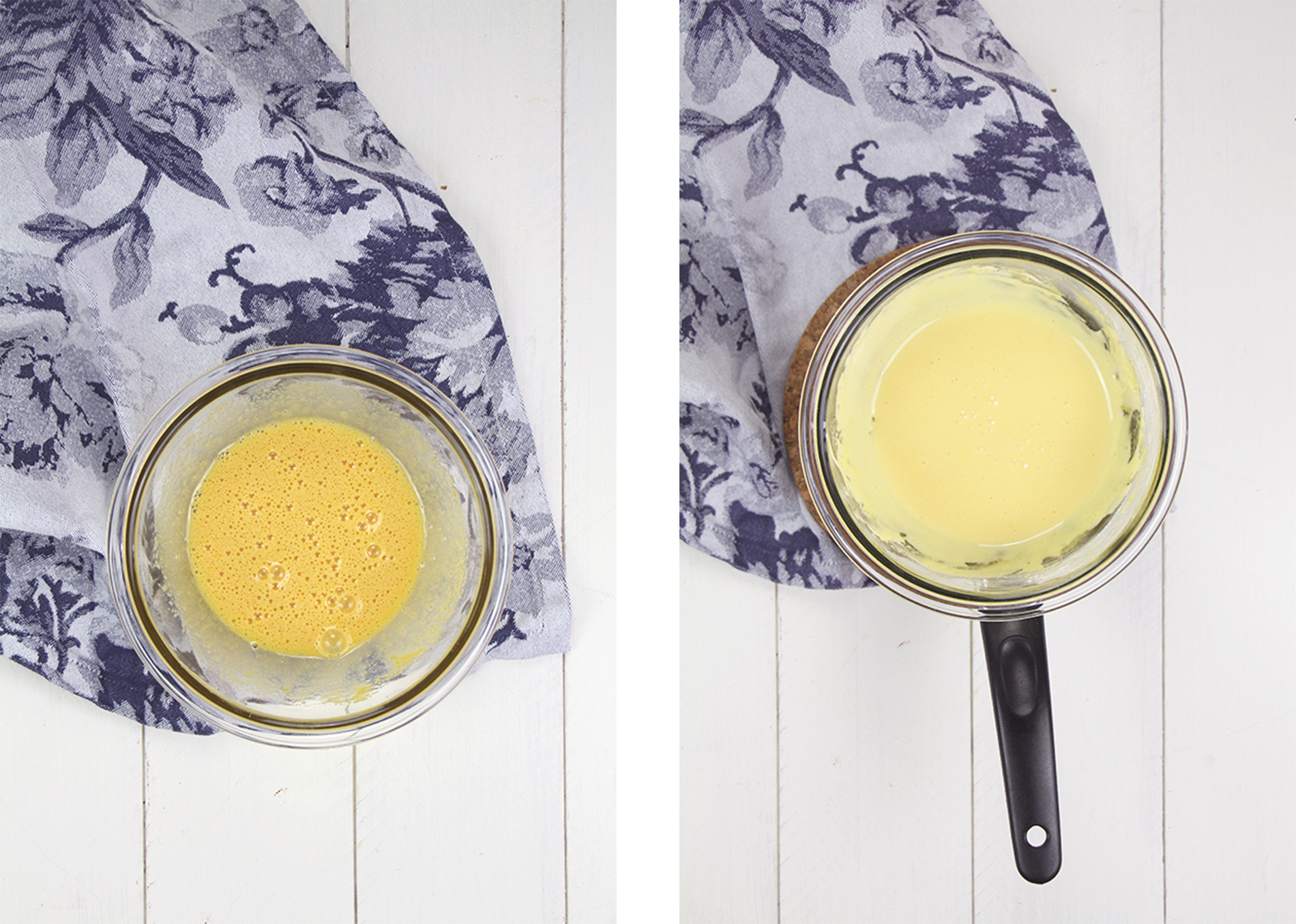 Primero de todo, separaremos las yemas de las claras. Pondremos las primeras en un bol no demasiado grande, junto con 30 gr del total del azúcar (reservamos la otra mitad) y la cdita de esencia de vainilla. Batiremos con unas varillas de mano durante 2 min, para que se integre muy bien y empiece a coger textura.