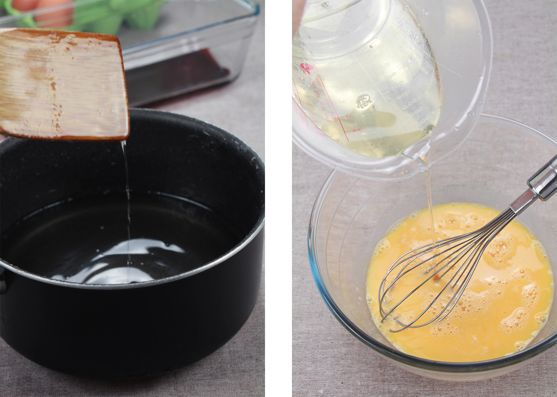 Seguiremos con el almíbar, que es sencillo, pero hay que conseguir el punto perfecto. En un cazo más grande pondremos el resto de azúcar y de agua indicados en la receta a fuego medio-alto y lo dejaremos hasta que hierva. Cuando empiece a hervir tendremos que ir removiendo de vez en cuando para asegurarnos que no se pega y, lo más important, controlar el punto. Debemos conseguir el llamado «punto de lágrima», es decir, que cuando dejamos caer un chorrito de almíbar, éste caerá en un hilo casi continuo, sin hacer gotas, como veis en la foto. Este será el punto que debemos conseguir, cuando lo tengamos así, lo retiraremos y dejaremos templar unos 5 o 10 min.