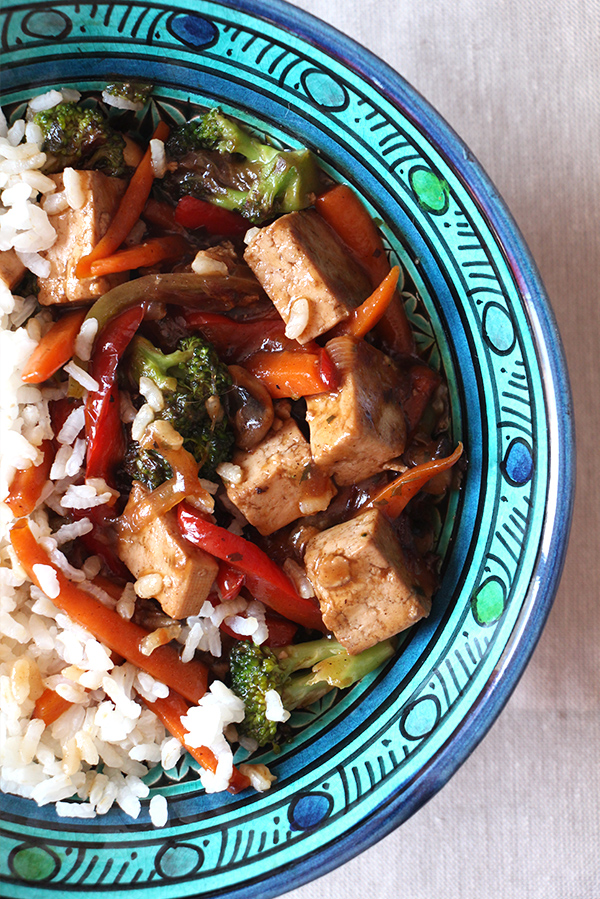 ¿Y cómo llegué a esta receta? Bueno, yo no suelo comer tofu, más allá de en sopas japonesas o alguna comida china. Justamente compré hace unos días un paquete para hacer sopa de miso (podéis ver la receta aquí), pero me sobraba bastante y claramente no iba a tirarlo. En paralelo, resulta que mi hermana hace unos meses que se ha hecho vegetariana, así que también me gusta mucho probar recetas que sé que luego le pueden gustar. Para romper la barrera de que el tofu es soso o aburrido, busqué maneras de condimentarlo y crear platos bien sabrosos y ¡qué delicia! El salteado de verduras me encanta, no sé a vosotros, pero es que además la salsa de caldo y soja, espesada con un poco de Maicena es todo un éxito.