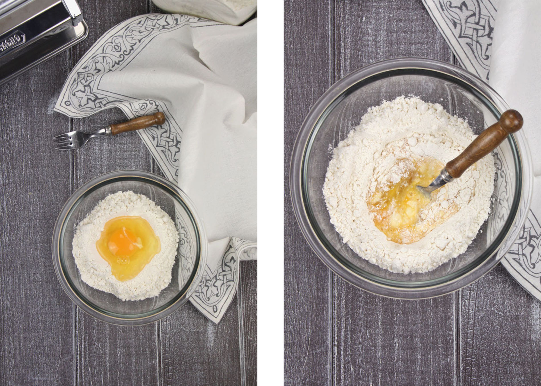 Empezaremos poniendo la harina en un cuenco o sobre la mesa de trabajo y haremos un hueco en el centro, donde colocaremos el huevo. Las indicaciones que os doy son para 1 plato de pasta, 100 gr. Las proporciones son siempre por cada 100 gr 1 huevo, así que podéis agrandar la receta siempre con esta proporción, en base a los comensales.