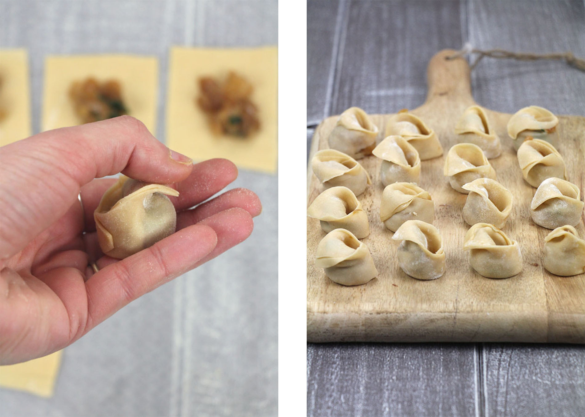 El proceso de formado es muy sencillo. Primero doblaremos una punta con la opuesta en diagonal, formando un triángulo. Apretaremos los bordes, presionando con los dedos, para unir los extremos y sellar el tortellini. Luego enrollaremos las puntas sobre nuestro propio dedo y presionaremos un poco para unir las puntas. Finalmente doblaremos el extremo superior hacia adelante ¡y listo!
